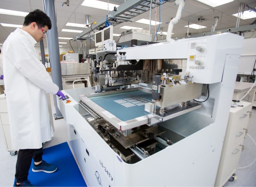 Screen printing has been applied in the manufacturing of innovative clean energy technologies. One example is photovoltaic (PV) panels. The technique is used to apply fine lines of silver paste on the front of the panels to form the conductive contacts needed to collect and carry electrical current. The back of a solar panel is coated with aluminum paste to enhance conductivity and reflect light back through the silicon wafer, increasing the efficiency of the PV cell. This technique is now being applied to the manufacturing of printed, thin-film PV modules.